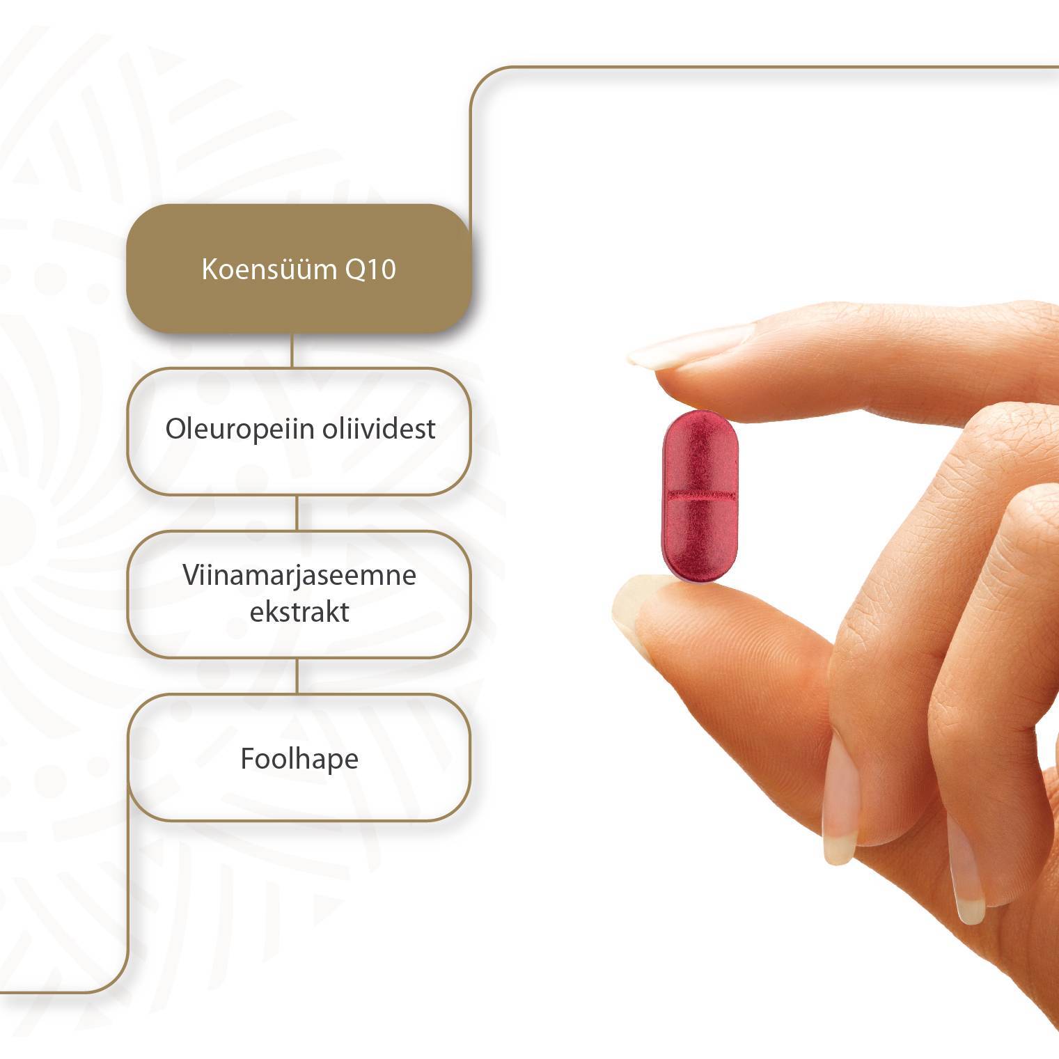 Spetsiaalne toidulisand südame ja veresoonte tervise toetamiseks ja -vererõhu säilitamiseks Vahemereäärse oliivilehe, viinamarja seemne ja punase sibula ekstraktiga.