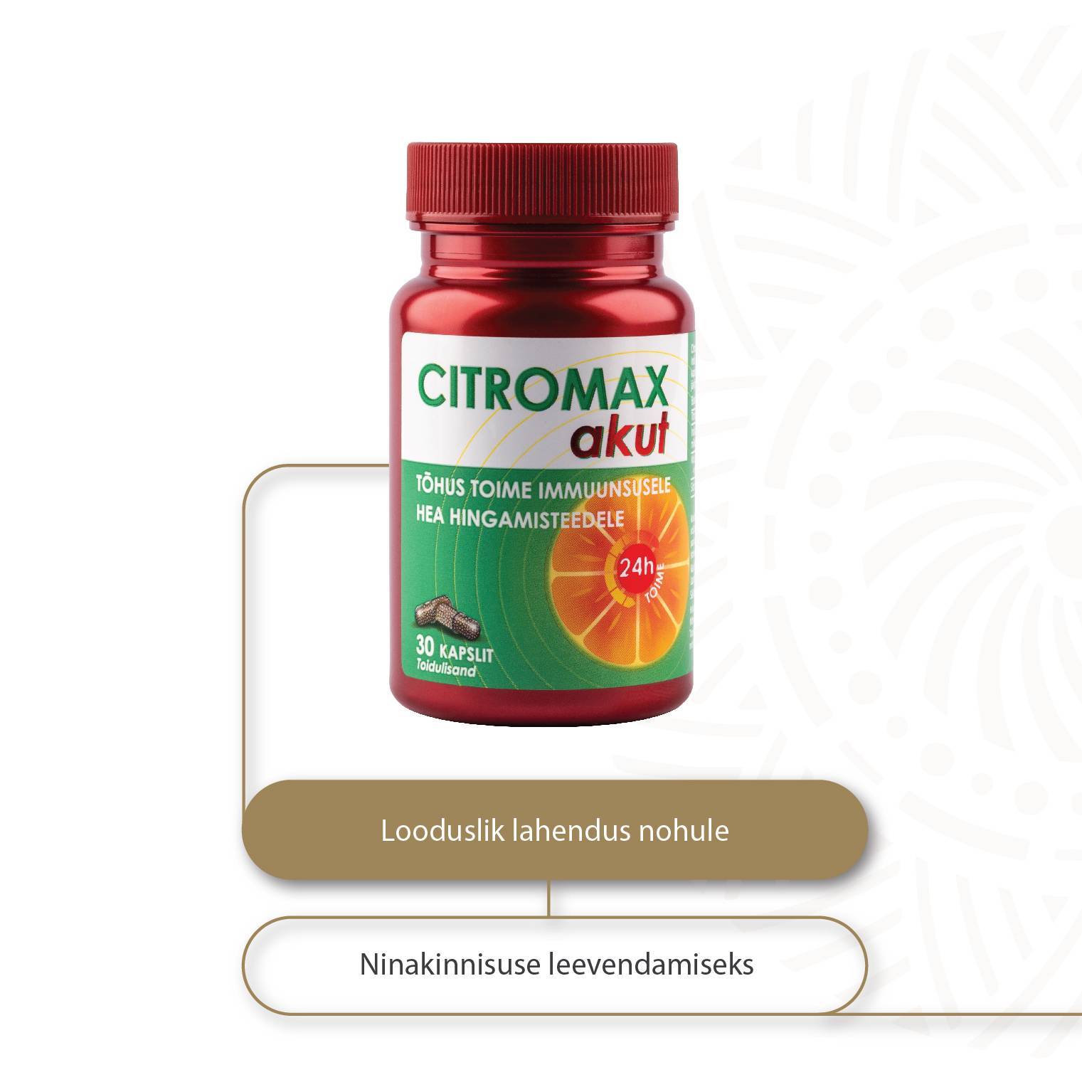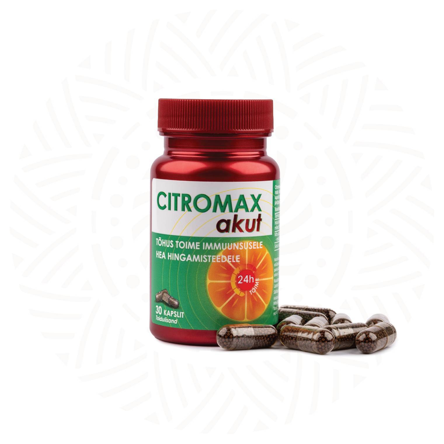 Citromax AKUT on spetsiaalne toode ülemiste hingamisteede hea tervise säilitamiseks tõmmu india kibelille, pelargooniumi ja mõruapelsini ekstraktiga. Citromax AKUT kapslid tagavad kiire ja samal ajal kauakestva toime, tänu spetsiaalsele toimeainet järkjärgult vabastava mikrokapslite tehnoloogiale.