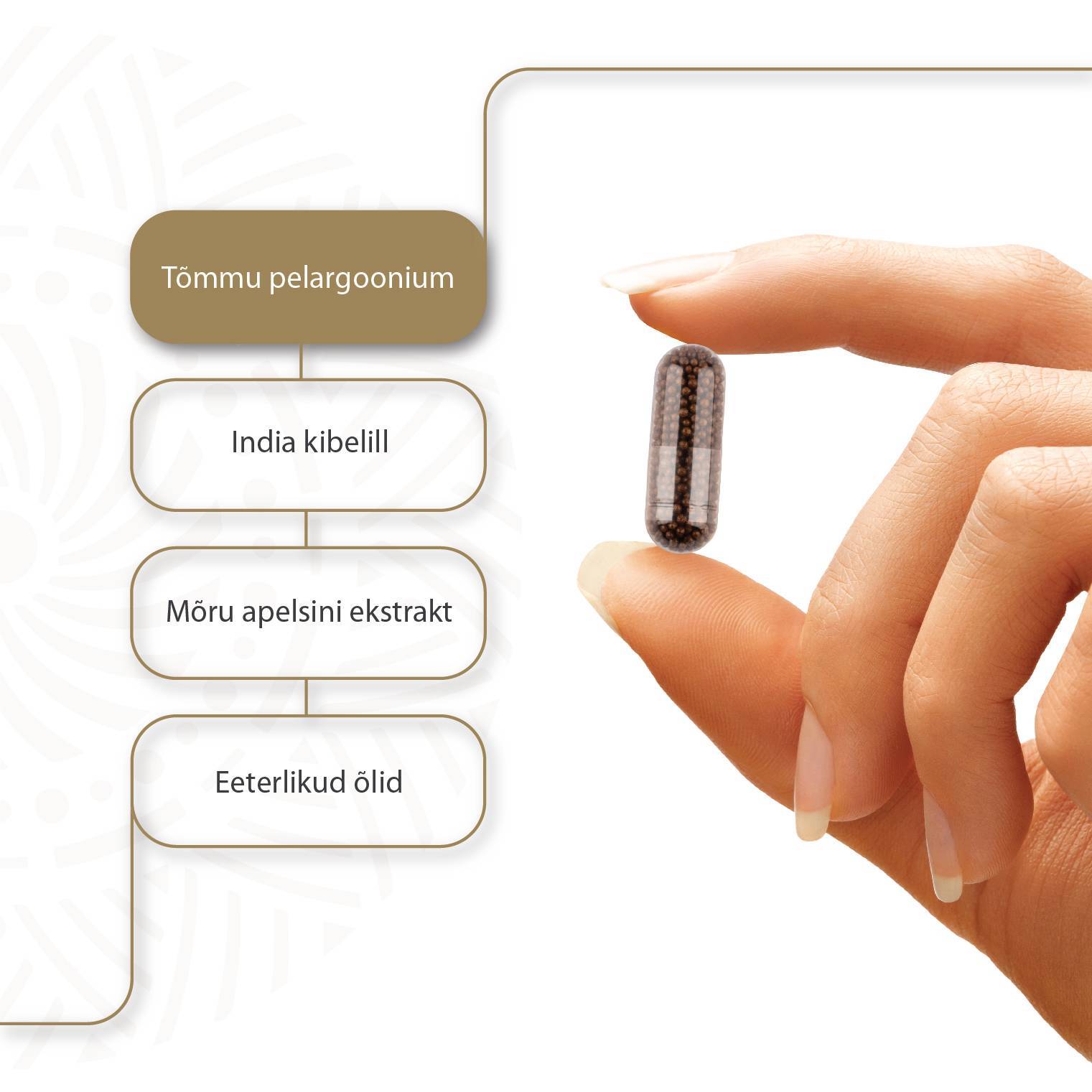 Koostisosad:  želatiin, paakumisvastane aine maisitärklis, emulgaator mikrokristalliline- ja etüültselluloos, tõmmu pelargooni (Pelargonium sidoides) juurte ekstrakt,  India kibelille (Andrographis paniculata) lehtede ekstrakt, mõruapelsini(Citrus aurantium) ekstrakt, looduslik glaseeraine shellak, sidruni- (Citrus limonum) , piparmündi- (Mentha piperita) ja eukalüpti- (Eucalyptus globulus) õli.