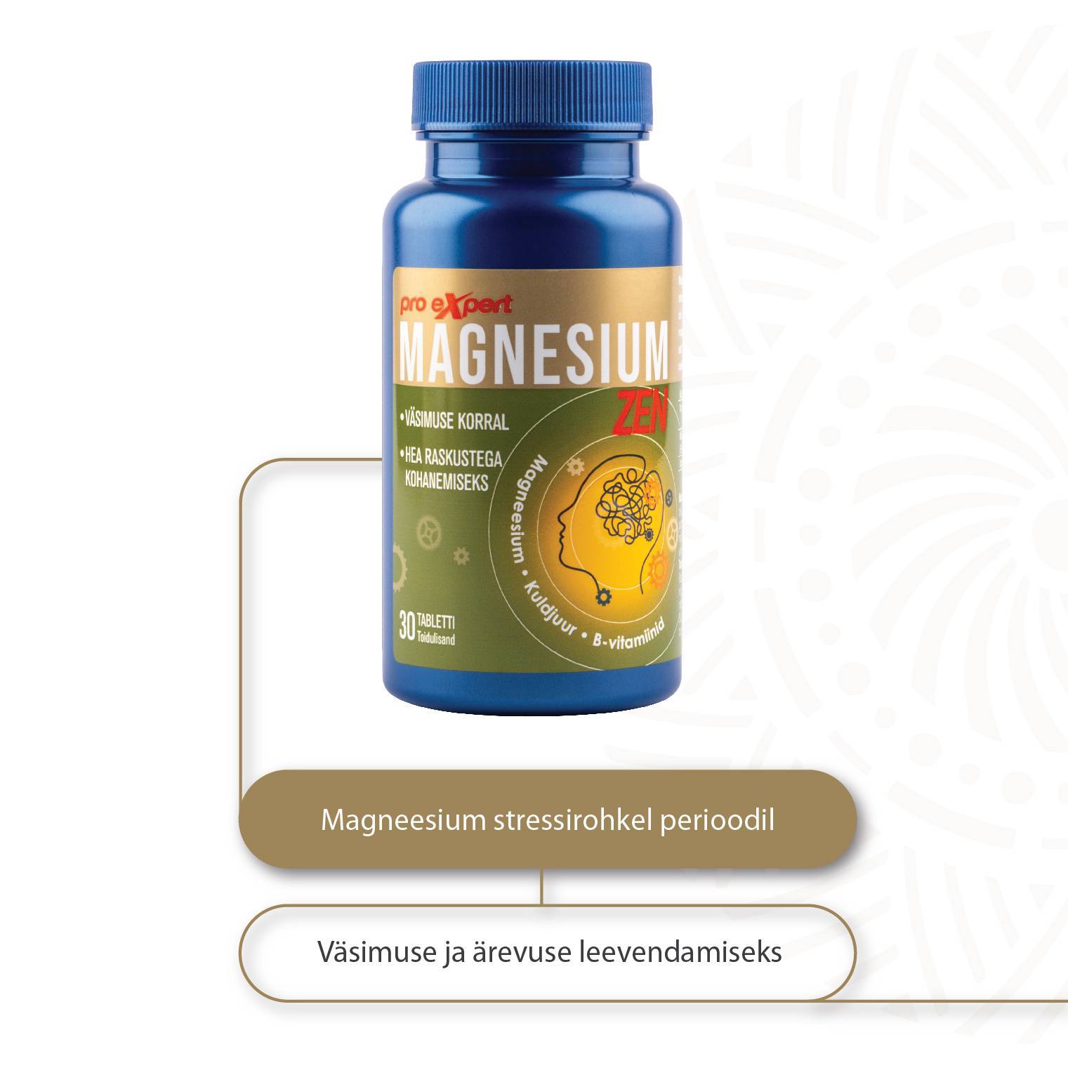 Magnesium Pro Expert ZEN on spetsiaalne toidulisand kasutamiseks vaimse stressi ja suure füüsilise koormuse korral magneesiumi, tsingi, B-grupi vitamiinide ning kuldjuure ekstraktiga.