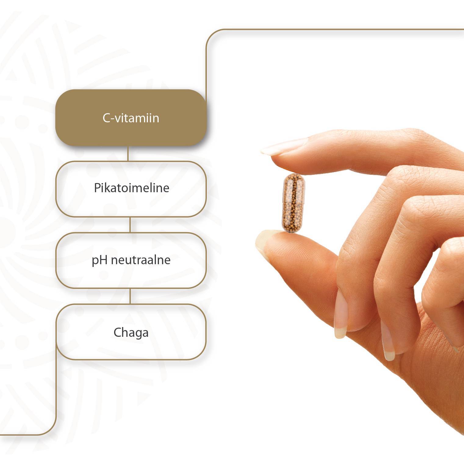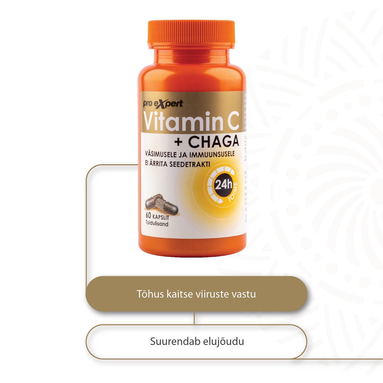 Vitamiin C Pro Expert ühendab neutraalse st. mittehappelise C-vitamiini ja standardiseeritud CHAGA ekstrakti jõu mikrokapslites, mis tagavad toimeainete kontrollitud ja järkjärgulise vabanemise.