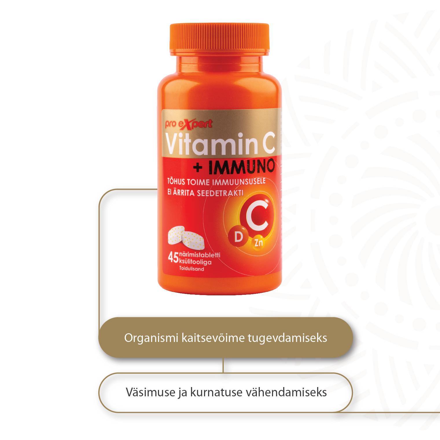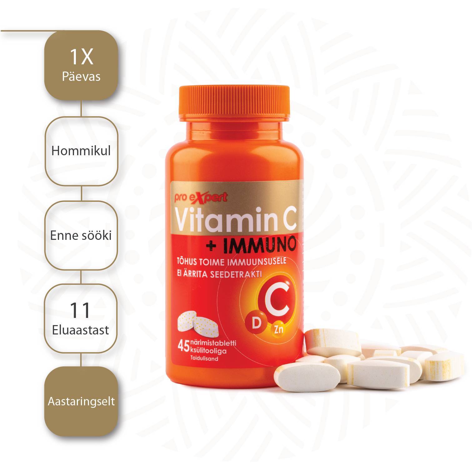 Värske virsiku maitselised närimistabletid Vitamiin C Pro Expert Immuno sisaldavad pH neutraalset st. mittehappelist C-vitamiini, orgaanilist tsinki ja tõhusa annuse D-vitamiini.