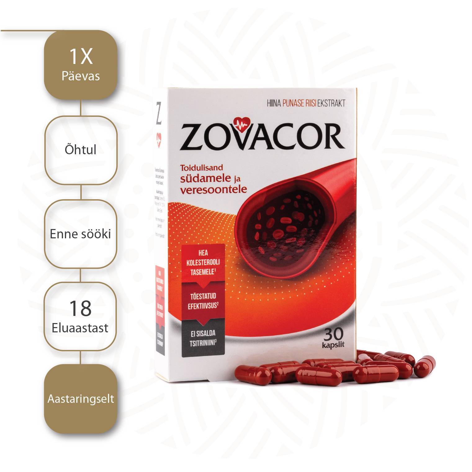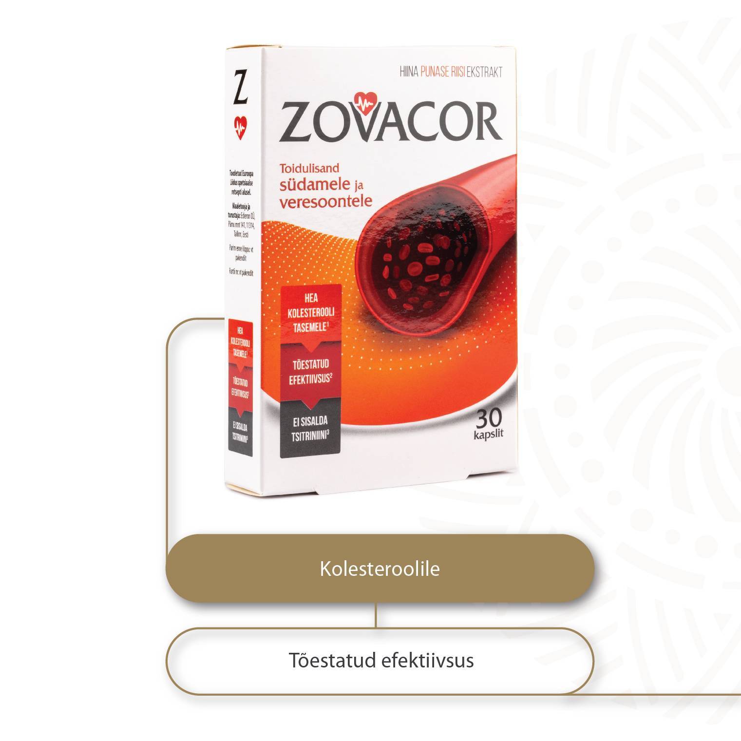 Zovacor on spetsiaalne toidulisand südame ja veresoonte tervise säilitamiseks. Zovacor sisaldab punase sibula (Allium Cepa) standardiseeritud ekstrakti, tervisliku kolesterooli taseme säilitamiseks ja punase riisi ekstrakti. Zovacor punase riisi ekstrakt on looduslikult meetodil kääritatud ning eriti puhas – see on tsitriniinivaba. Punase riisi ekstrakti kõige tähtsam toimeaine on monakoliin K. Sibul (Allium Cepa) toetab verevarustust väikestes veresoontes sh. südameveresoontes2 ja aitab kaasa normaalse verelipiidide (kolesterooli1 ja triglütseriidide) taseme hoidmisele. Tervislik kolesteroolitase on tähtis, sest üleliigne kolesterool võib põhjustada veresoonte ahenemist ja kahjustada veresoonte tervist.