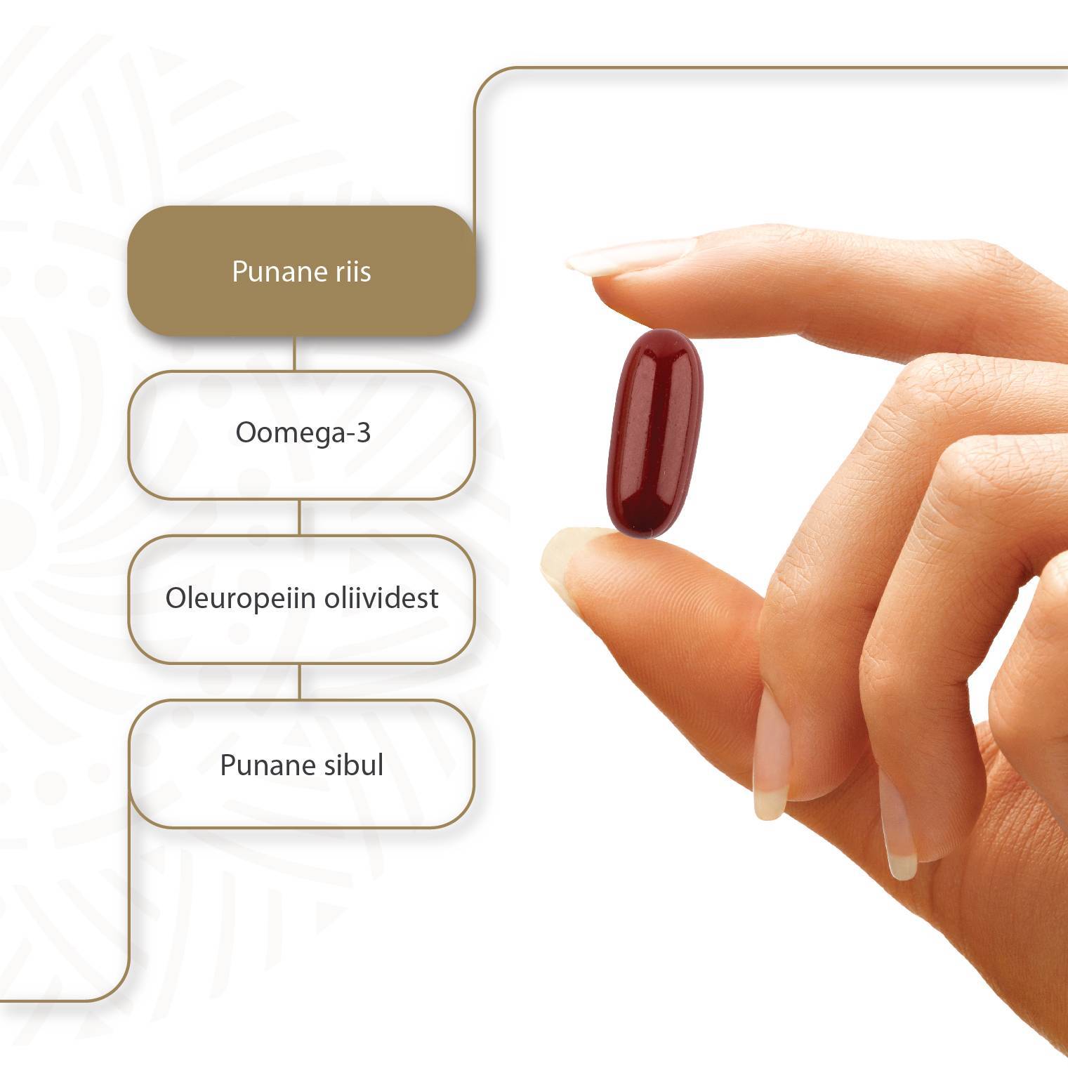 Koostisosad: Kalaõli, želatiin, Hiina kääritatud punase riisi (Monascus purpureus) tsitriinivaba ekstrakt, niiskusesäilitaja glütseriin, oliivi lehtede (Olea Europea L.) ekstrakt, punase sibula (Allium Cepa) ekstrakt, polikosanoolid suhkruroo vahast, värvaine punane raudoksiid ja karmiin.