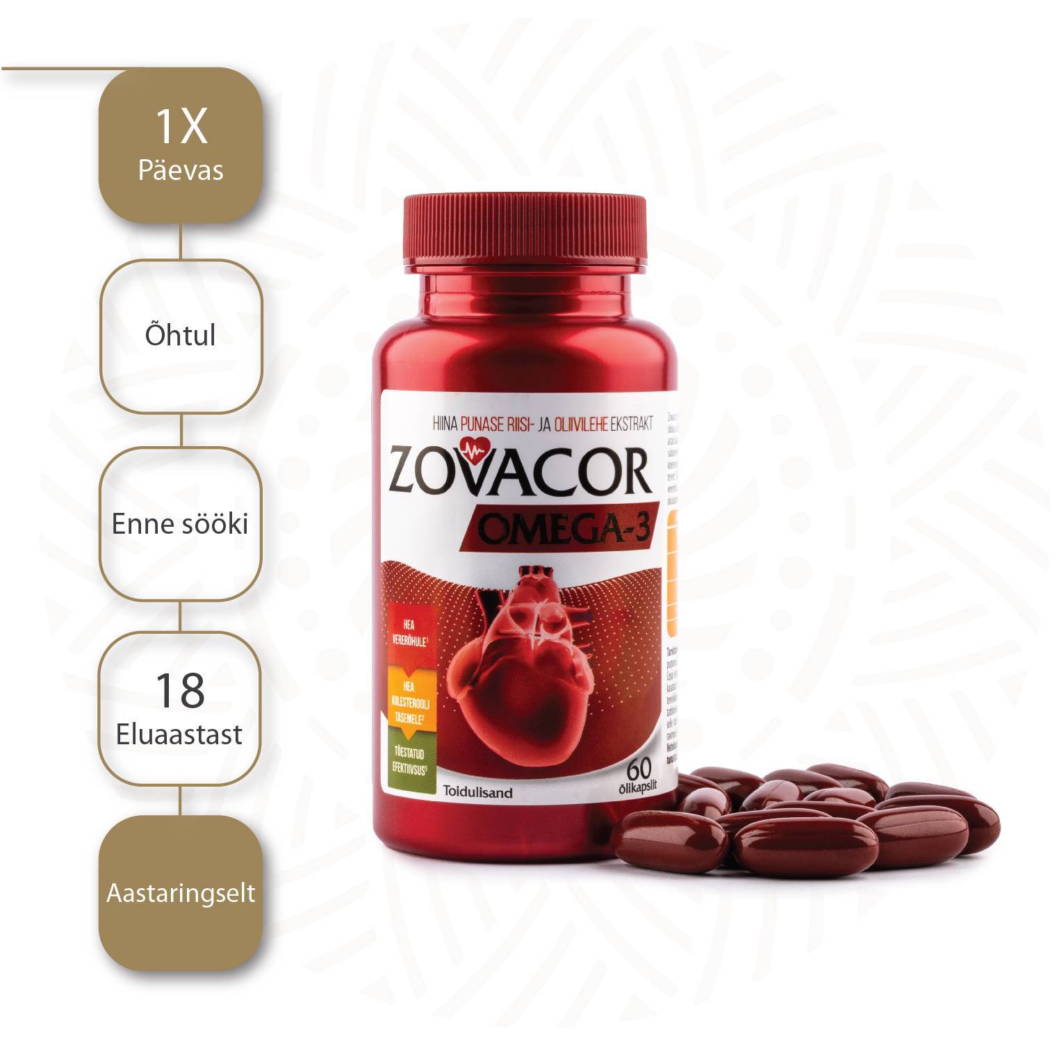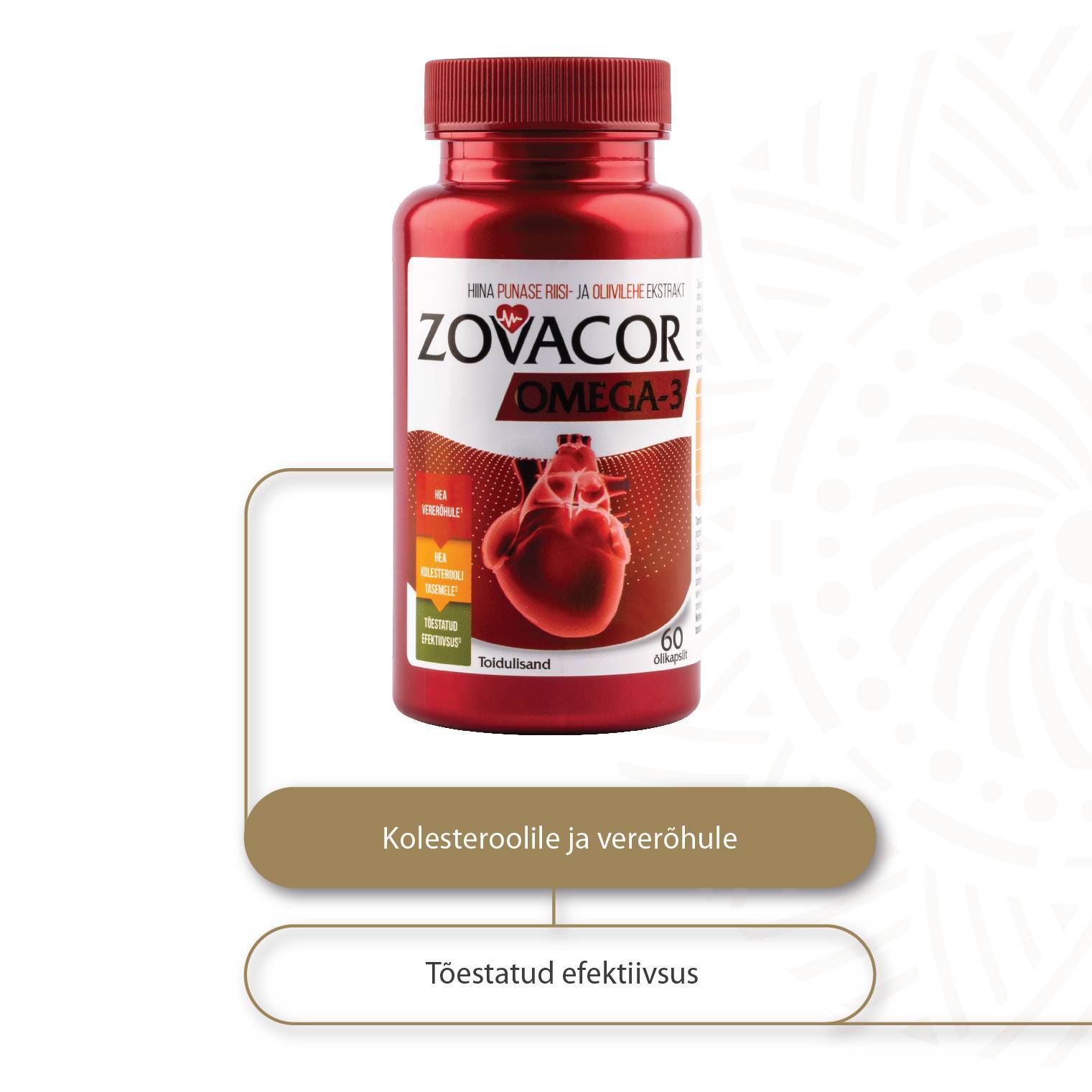 Zovacor Forte on spetsiaalne toidulisand südame ja veresoonte tervise säilitamiseks Hiina punase riisi, Omega-3, punase sibula ja oliivilehe ekstraktidega.